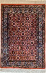 Moud Tapijt uit India. De maat van de tapijt is 160 x 110 cm.De tapijt heeft heel hoge kwaliteit en heel fijn geknoopt. De tapijt wordt met een tracking nr. verzenden. U kunt de tapijt dan online volgen.