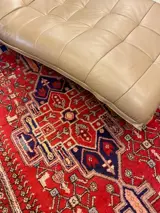 Prachtig Perzisch tapijt in zeer goede staat. Het is handgemaakt met natuurlijke en duurzame materialen, er is wol gebruikt op katoen. De manier waarop het is geknoopt en de verscheidenheid aan stilistische motieven, met bloemen- en groentekanten en vooral verschillende geometrische vormen maken van dit stuk een waar kunstwerk. Het heeft, zoals gewoonlijk, een geometrisch centraal medaillon in de vorm van een "blad" en een rijke rand die het bloemenveld omlijst. Het is een stuk van grote schoonheid en karakter, een echt juweel dat elke kamer aankleedt dankzij de patronen en levendige kleuren. De basis is roodachtig van kleur, wat contrasteert met de blauwachtige tinten die andere kleuren overheersen, zoals groen of licht crème.