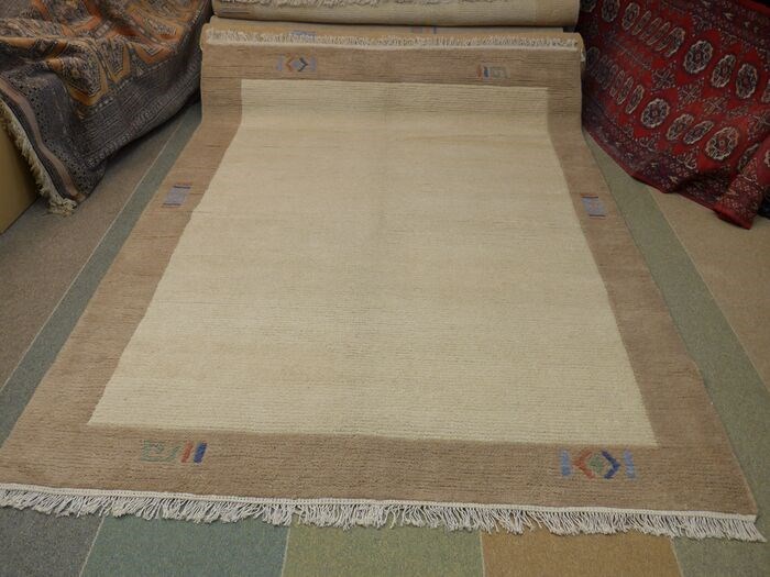De kleur van donkerbeige op het spoor en lichtbeige in het midden van het tapijt hangt af van hoe de wol is gekamd
