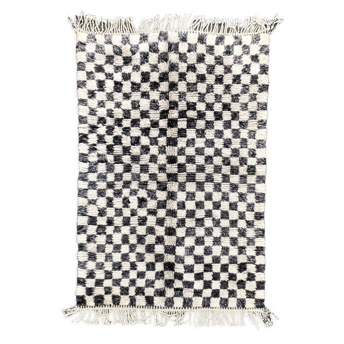 Het Beni Ouarain-tapijt is ontstaan in de bergachtige streken van de Midden-Atlas in Marokko door de Aït Ouarain-stammen. Het Beni Ouarain Marokkaanse wollen vloerkleed is geweven in een zachte en dikke natuurlijke wol. Het is nu erg populair vanwege de strakke en minimalistische stijl die het biedt en vanwege de esthetiek en het comfort dat het biedt. Een minimalistische stijl impliceert het hebben van verfijnde kleuren zoals zwart en wit of beige. Hij is het meest bekend om de kwaliteit van zijn wol en de geschiedenis van zijn stam. Ze zijn met de hand geweven en vallen op door hun grote rechthoekige afmetingen, geometrische patronen en minimalistische stijl.
