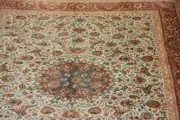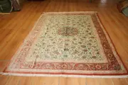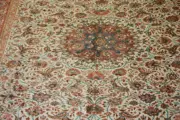 Van de mooiste handgemaakte zijden oosterse tapijten zijn die gemaakt in de Perzische stad Qom de meest superieure. Het lijkt erop dat er een constante concurrentie is tussen tapijtwevers, dus er kunnen prachtige zijden vloerkleden worden gemaakt. Dit extra fijne gesigneerde Perzische zijden Qom-tapijt kan worden omschreven als een van deze prachtige stukken. Het meet 280 cm x 200 cm (9'x6'6") en heeft een opvallend wit veld versierd met verschillende bloemmotieven, arabesken en wijnbladeren en omgeven door lichtroze randen. Zacht en gedempt oppervlak laat het Perzische zijden tapijt op zijn best zien.