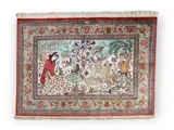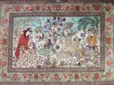 Een prachtig Perzisch zijden qum-tapijt van meesterwever Noori met een scène van leven na de dood in het paradijs.