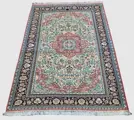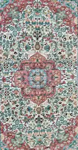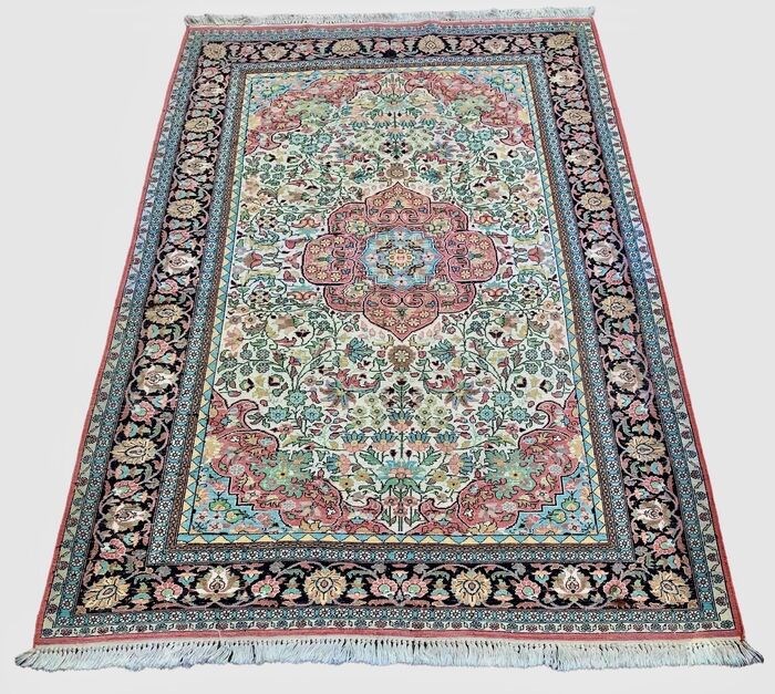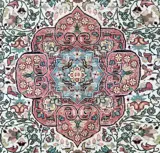 Srinagar tapijt van katoen, wol en zijde, fijne knoop, bloemdessin met centraal medaillon, handgeknoopt uit begin 1900. Het klassieke motief met warme kleuren maken het tot een elegant tapijt met een groot scenisch effect.