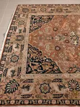 Welkom: hierbij wordt een antiek Srinagar-tapijt aangeboden van ongeveer 80/90 jaar oud. Het tapijt is in goede staat voor zijn leeftijd. Het ontwerp is met jachttaferelen, ik verzeker u dat het live spectaculair is. Het maken van tapijten in India werd waarschijnlijk ontwikkeld door de Grote Mogol Akbar (1556-1605), die Perzische ambachtslieden samen met bekwame patroonkunstenaars samenbracht om tapijten te produceren in zijn eigen paleis.