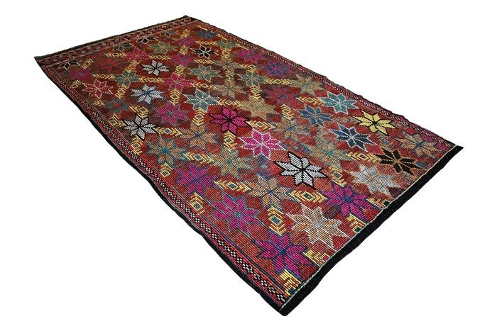 Indrukwekkende grote semi-antieke Sumak Kelim. Zeer goede staat, professioneel gereinigd en klaar voor gebruik.