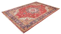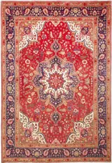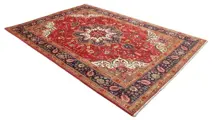 Deze tapijten worden geknoopt in werkplaatsen in de stad Tabriz in het noordwesten van Perzië. Een robuust, duurzaam tapijt met korte, grove pool. Het patroon bestaat uit een medaillon omgeven door arabesken, treurwilgen en cipressen.