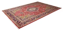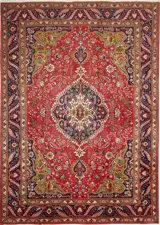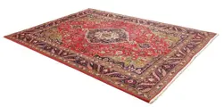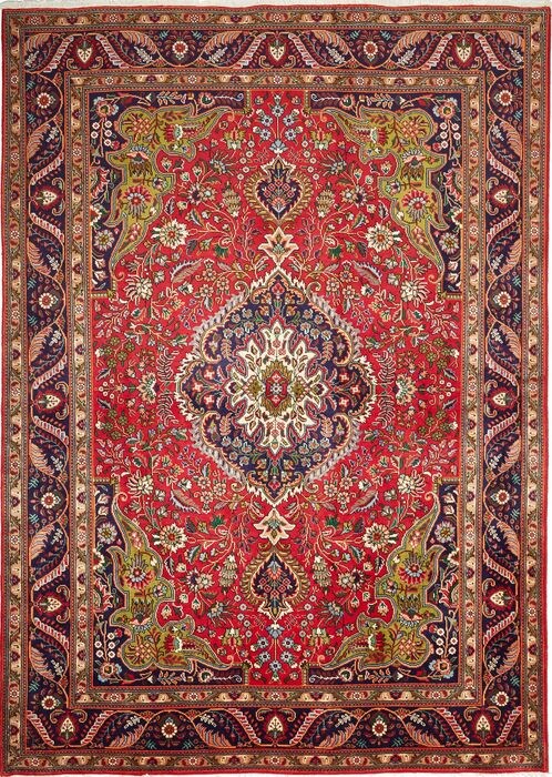 Deze tapijten worden geknoopt in werkplaatsen in de stad Tabriz in het noordwesten van Perzië. Een robuust, duurzaam tapijt met korte, grove pool. Het patroon bestaat uit een medaillon omgeven door arabesken, treurwilgen en cipressen.
