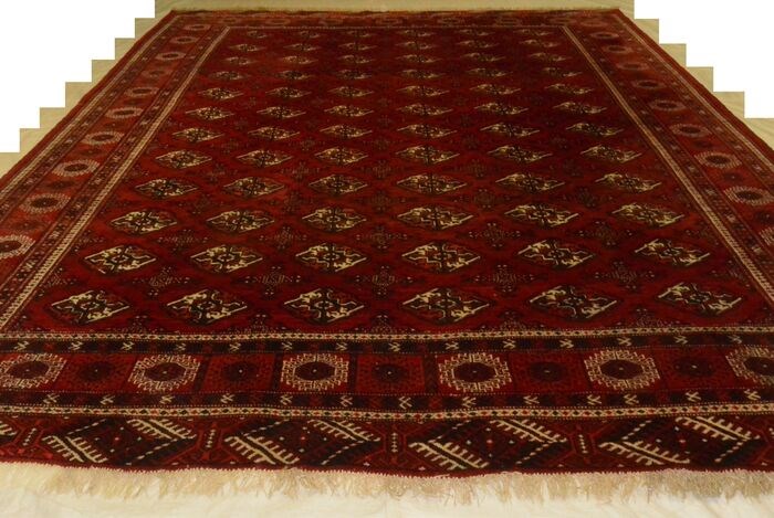 Ik bied een heel mooi Perzisch tapijt -Turkeman- aan in goede algehele staat. Dit ongeveer 6 mm dikke tapijt is bewerkt in warme tinten. Het geometrische hoofdpatroon wordt omlijst door verschillende uitvoerig bewerkte randen. Het tapijt heeft een lichte kleurvervaging die nauwelijks opvalt. Het straalt een gezellige sfeer uit.