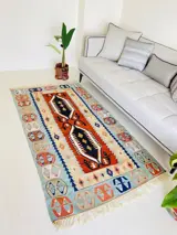 Kelims behoren net zo goed tot het artistieke erfgoed van de wereld als de schilderijen van Leonardo da Vinci of Michelangelo. Die kelim is met de hand geweven door nomadische Turkmenen (yoruks) uit het zeer bekende veawing-district Kayserie Turkey met de wol van fokdieren en garens die daaruit zijn geproduceerd, gekleurd met natuurlijke kruidenwortelkleuren.