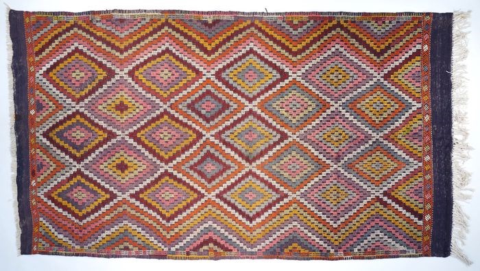 Handgeweven vintage kelim vloerkleed. Stammen Turkse rustieke kilim. Het is een historisch en cultureel voorbeeld. Volledig handgeweven, geborduurde tribal primitieve gebied kilim. Traditioneel geometrisch ontworpen uniek stuk gemaakt van hoogwaardige materialen. Gemaakt in Turkije door nomadische dorpelingen voor culturele ceremonies, deze kelim wordt in kisten bewaard, daarom is de staat erg goed en is er geen schade of gerepareerd gebied. Kelim-ontwerp is speciaal voor het weefgebied, elk dorp heeft een ander cultureel ontwerp.