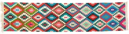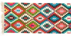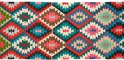Vintage handgeweven kelimtapijt met geometrisch ontwerp. Het is gemaakt door nomadische mensen van hoogwaardige materialen. De staat van de kelim is zeer goed, er is geen enkele beschadiging, gerepareerd of bevlekt gebied dat klaar is voor gebruik. Het weven van kelim is een traditie in Turkije en werd gemaakt voor culturele ceremonies.