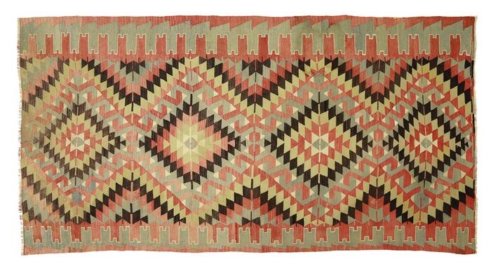 Klassiek traditioneel wollen kelim tapijt.Ongeveer 60 jaar oud en met de hand gemaakt in Anatolië, in Turkije.
