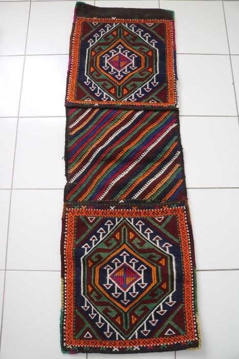 Dit is een van de vintage Turkse Usak kilim zadeltassen die we in onze voorraad hebben.