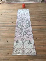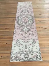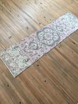 Dit vintage wol op katoen loper vloerkleed is handgemaakt geknoopt en geweven