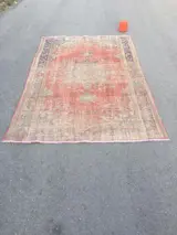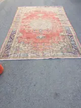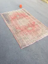 Dit vintage wol op katoenen vloerkleed is handgemaakt geknoopt en geweven