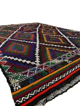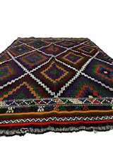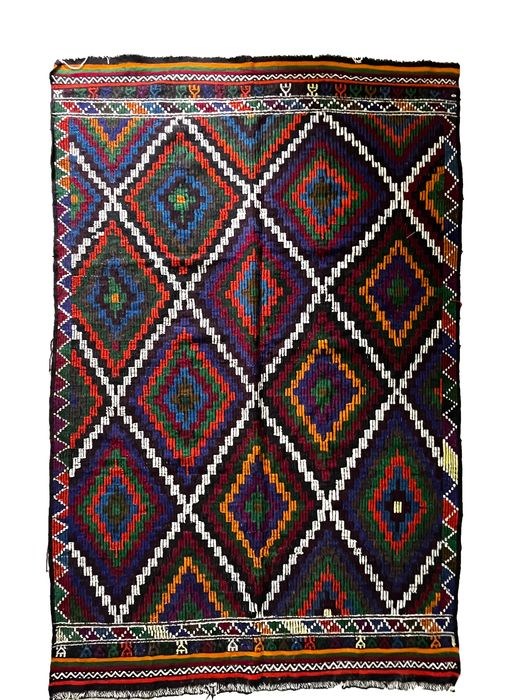 Deze unieke handgeweven vintage kelim is gemaakt in de jaren 70-80 door nomaden in het dorp Usak. Voordat ze met het weven begon, was de wever haar schapen aan het scheren, de wol aan het schoonmaken, kammen en spinnen om het beste garen van kilim te hebben. Tapijten weven is een traditie in Turkije en elk dorp en elke stam heeft een andere ontwerp- en weeftraditie. Dit vloerkleed heeft een karakteristieke combinatie van kleuren en design.