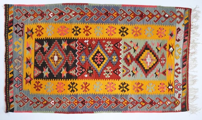 Handgeweven vintage kilim vloerkleed. Stammen Turkse rustieke kilim. Het is een historisch en cultureel voorbeeld. Volledig handgeweven, geborduurde primitieve tribale kilim. Traditioneel gestreept ontworpen uniek stuk gemaakt van hoogwaardige materialen. Gemaakt in Turkije door nomadische dorpelingen voor culturele ceremonies, deze kelim is opgeslagen in kisten, daarom is de staat zeer goed en is er geen schade of gerepareerd gebied. Kelim-ontwerp is speciaal voor weefgebied, elk dorp heeft een ander cultureel ontwerp.