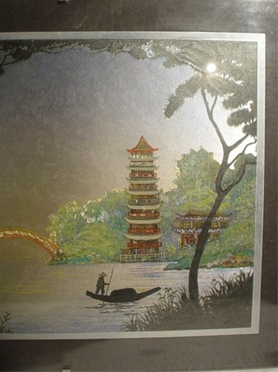 Voorstelling in kleur van een chinese visser met boot in een pagode landschap.