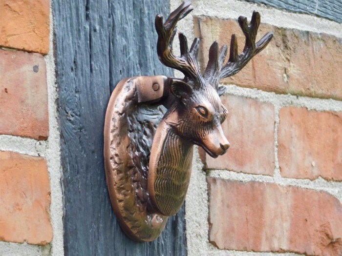 Prachtig vormgegeven deurklopper van een Hertenhoofd, gemaakt van antiek ijzer in koperkleur!