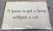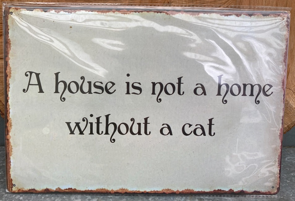 Leuk metalen bordje met tekst “A house is not a home without a cat”
