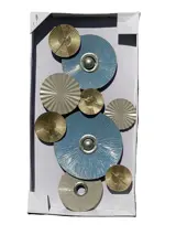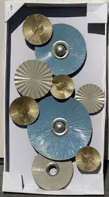 Deze royale metalen wanddecoratie bestaat uit zorgvuldig bewerkte schijven in verschillende groottes en structuren.