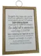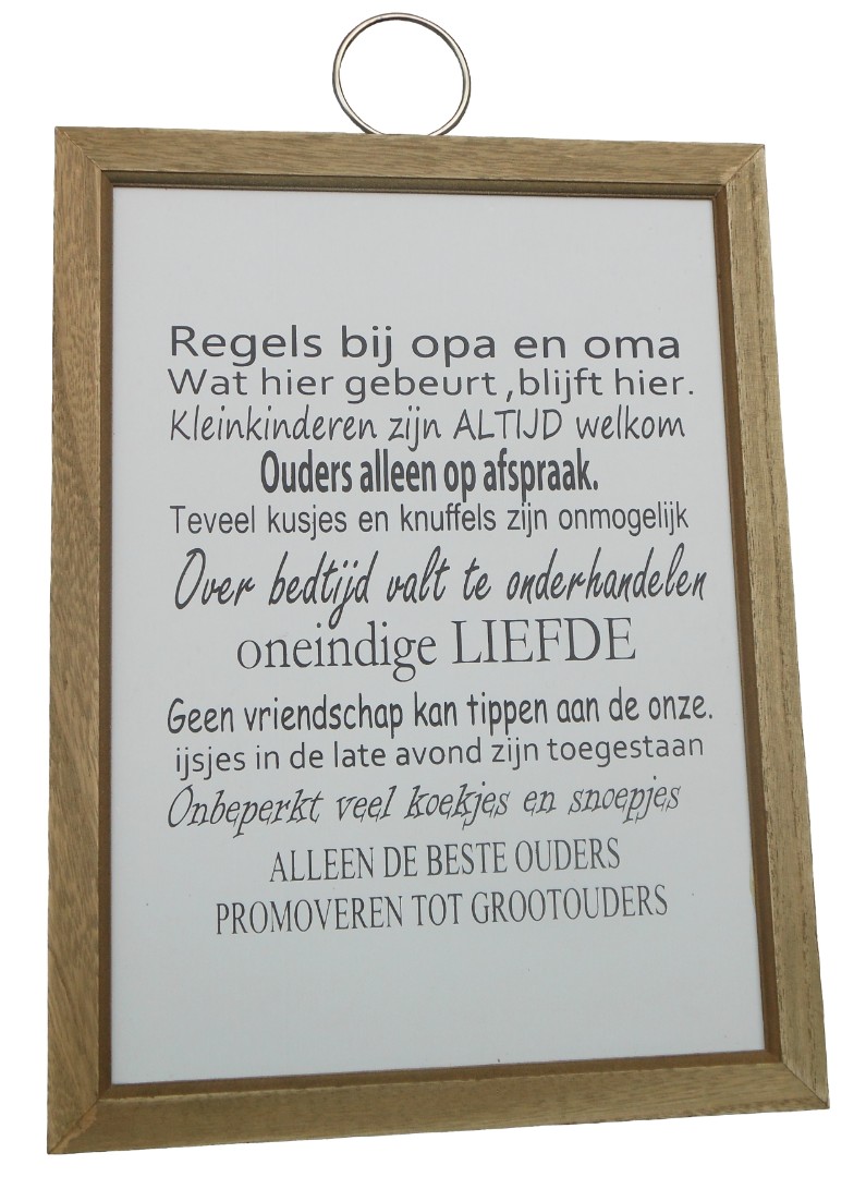 Wit tekstbord in een lijst van naturel hout en chroom ophangring.