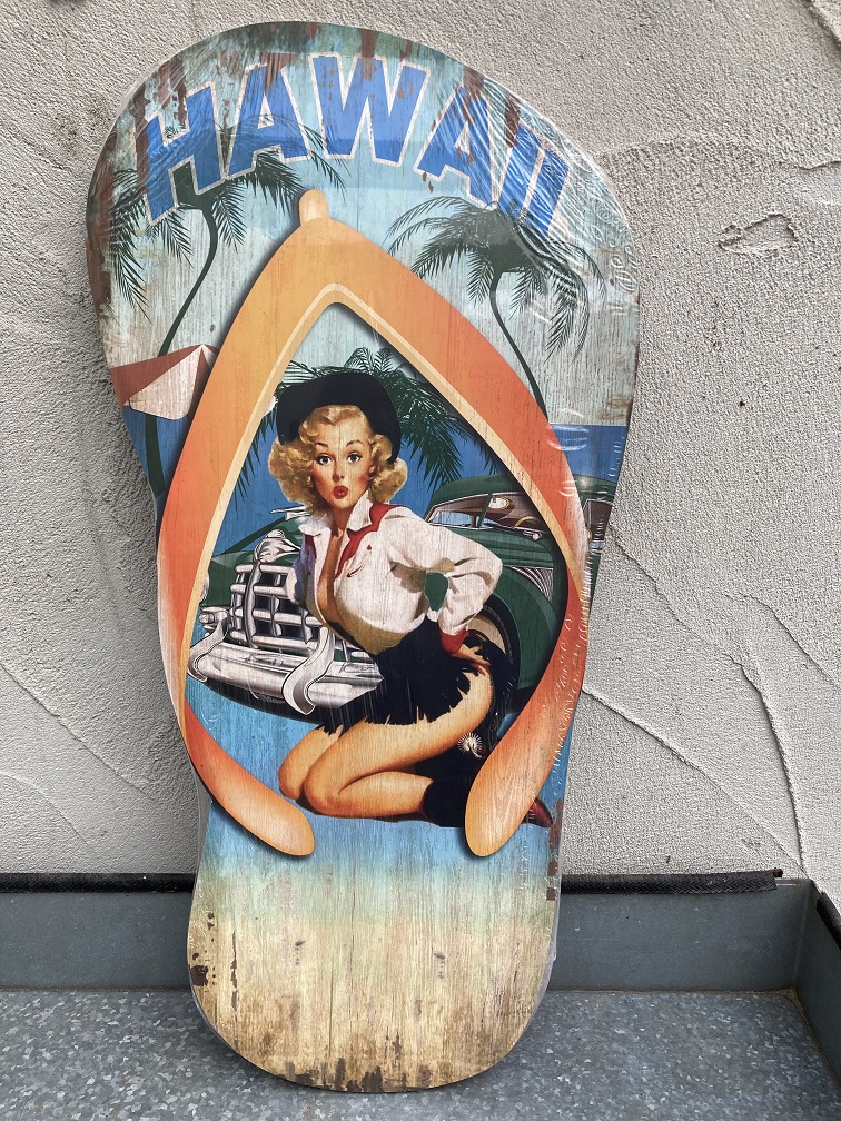 Een prachtig grote wanddecoratie in de vorm van een teenslipper, met vrolijke zomerse kleuren en een afbeelding van een dame op een klassieker.