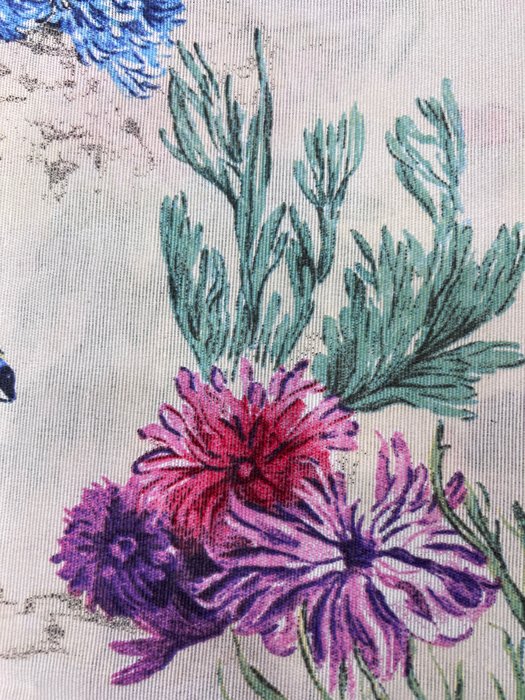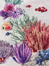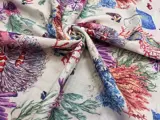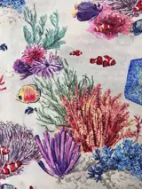 Zeer elegante witte katoenen stof met een rijke decoratie in maritieme stijl, afgebeeld door zeewier, schelpen, koralen en vissen