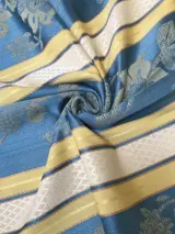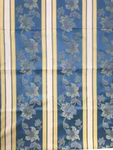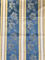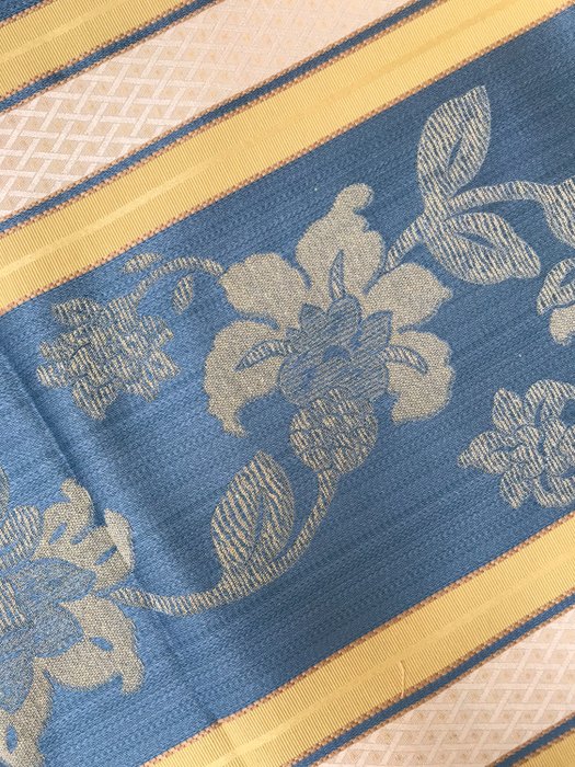 Luxe damaststof van de Italiaanse zijdefabrieken San Leucio, in een prachtige koningsblauwe kleur afgewerkt en verrijkt met een rijke florale decoratie typisch voor damast, doorkruist door in goud bewerkte banden.