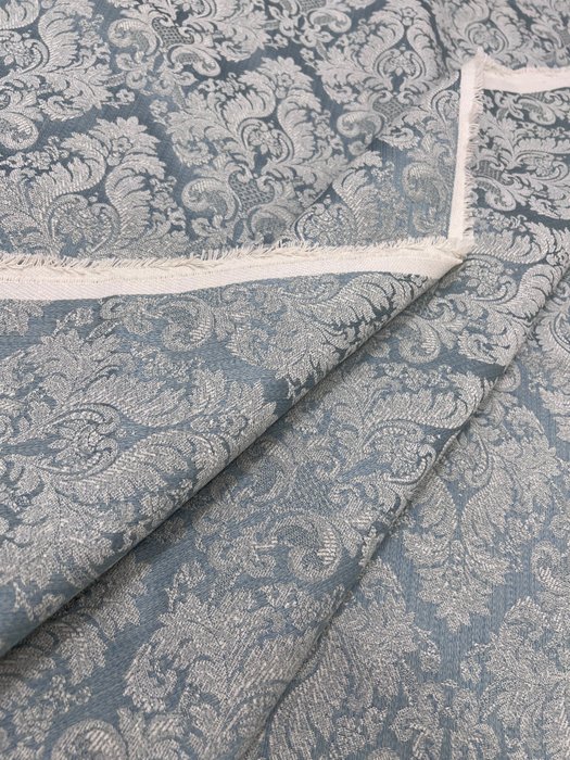 Prachtige luxe stof gemaakt met shantung-techniek in helder poederblauw satijn en verfraaid met parelwitte bloemenruiten, die perfect de Franse rococo-barokstijl van het Marie Antoinette-tijdperk belichaamt.