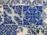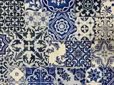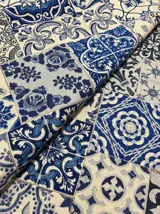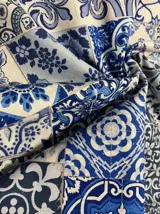 Mooie witte katoenen stof met rijke decoratie in mediterrane stijl met witte en blauwe Capri majolica