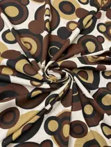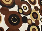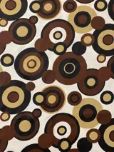 Beige achtergrond versierd met overlappende geometrische cirkels in de kleuren bruin, saffraan en zwart die opvallen in al hun schoonheid.