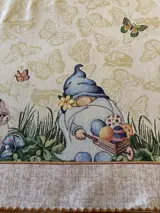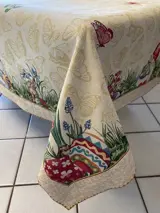 tafelkleed: cm 245 x cm 145 versierd met paaseieren en konijnen op een beige achtergrond met vlinders