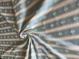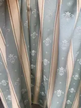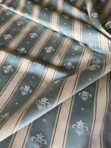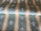 uitgebreide stof rijkelijk versierd met banden en Fleur de Lys in aquamarijnblauw afgewisseld met crèmewitte banden met een visgraatstructuur met een delicate bruine draad om het contrast te versterken.