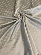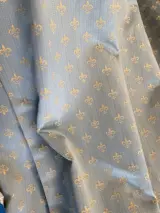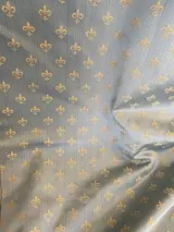uitgebreide stof rijkelijk versierd met gouden Fleur de Lys op aquamarijnblauwe shantung-achtergrond om het contrast te versterken.