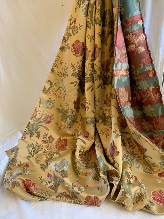 Elegante gebloemde damaststof vervaardigd door San Leucio met heldere gouden versieringen in satijnen lampas voor stoffering en gordijnen voor klassieke en prestigieuze high-end omgevingen.