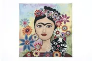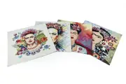 U ontvangt 4 prachtige ongezoomde wandtapijten, met herinterpretaties van de grote Mexicaanse schilder Frida Kahlo, van ongeveer 45 cm x 45 cm.
