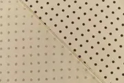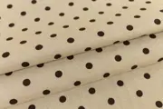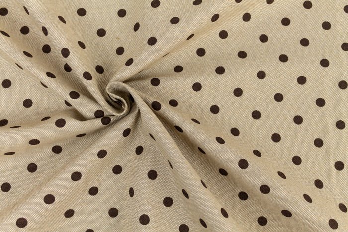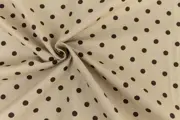 Fantastische mix van katoen en polyester met een beige achtergrond en bruin stippenpatroon. Een stof die erg prettig aanvoelt, vrij zwaar en veelzijdig is, dus geschikt voor verschillende doeleinden.