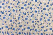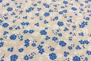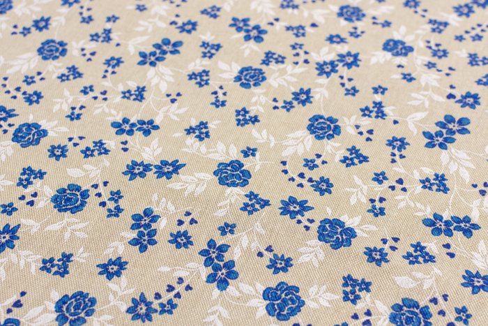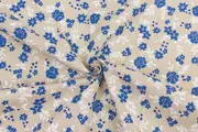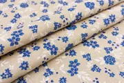Prachtige katoen en polyester mix stof met een beige achtergrond en een dessin van blauwe bloemen en witte bladeren. De stof voelt erg prettig aan, is vrij zwaar en veelzijdig, dus geschikt voor verschillende doeleinden.