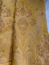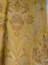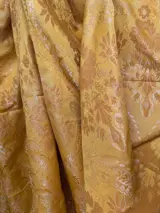 Elegante lampas damast satijnstof voor stoffering en draperie, voor klassieke en prestigieuze omgevingen voor hoge vertegenwoordigers. Gouden kleur met zeer fijne veelkleurige bloemmotieven. Dit is een dubbel stuk stof van 290 x 280 cm.