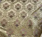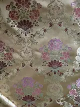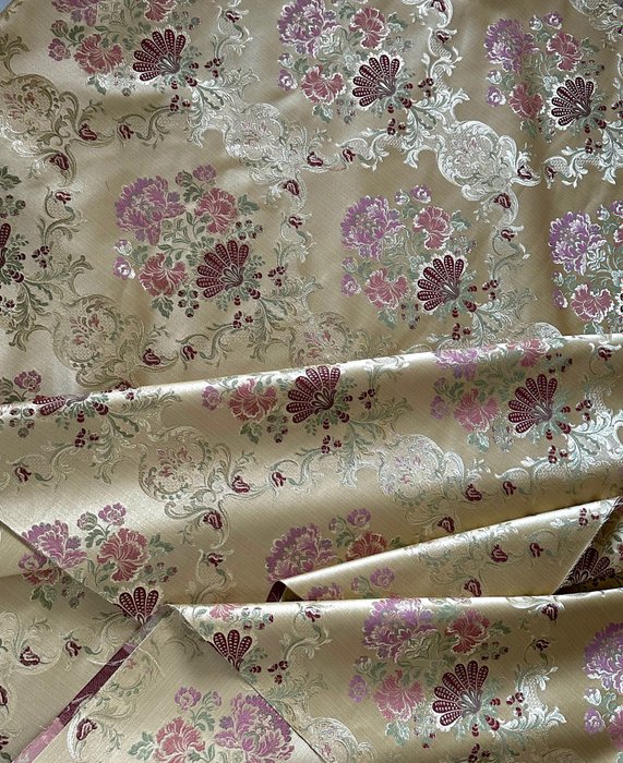 Zeer elegante gouden San Leucio damaststof in barokstijl met verfijnde veelkleurige bloemendecoratie typisch voor Italiaans damast.