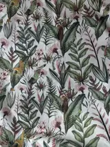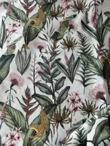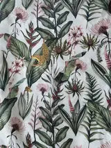 Prachtige Sanderson stof met rijke all-over tropische jungle decoratie met tijgers en tropische planten, gemaakt met een print van verschillende soorten bladeren in groentinten in retro stijl.