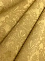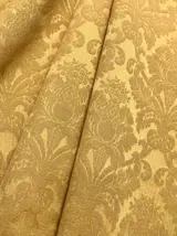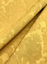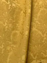 Prestigieuze, heldergouden San Leucio Venetiaanse damaststof met rijke bloemendecoratie die zich uitstrekt over het hele veld, toon op toon.