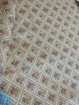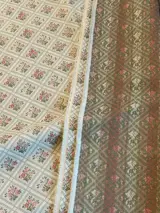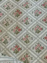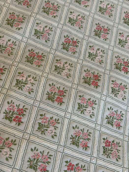 Elegante lampas-damaststof voor meubelbekleding en gordijnen voor klassieke en prestigieuze high-end omgevingen, op een champagnekleurige basis met uiterst fijne veelkleurige bloemendecoraties. Dit is een dubbel laken 3.20 x 3.00 cm, geschikt voor stoffering of gordijnen.