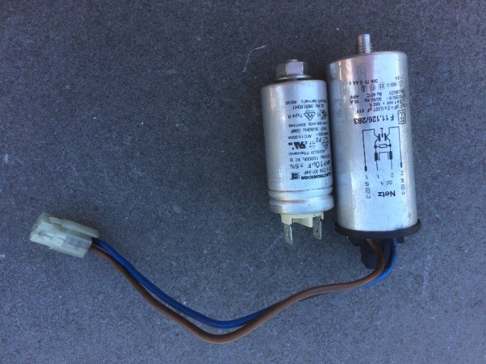 Condensator wasmashine Bosch/Siemens, e.a. motoralu. Electronicon condensator E12.C58-30104F (10uf max 300 V.) 5,-€alu. Netz condensator F11.126/283 (0,47uf + 2 x 0,027uf) 20,-€samen 22 euro+32495577180
