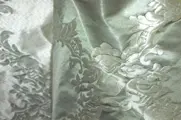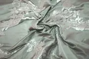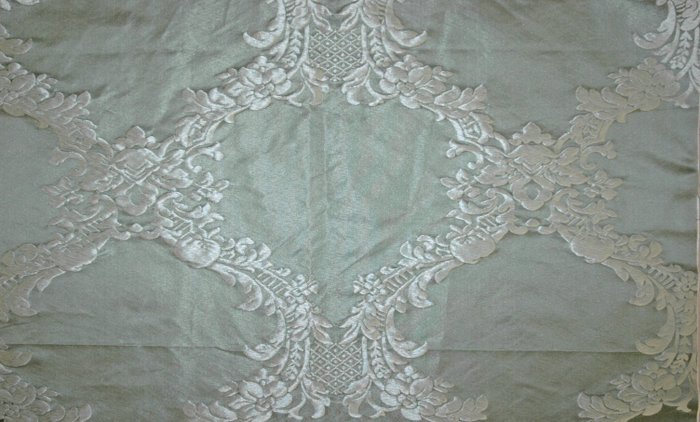 zachte zijdekleur van een variant van aquagroen en verleidelijke grijze textuur geschikt voor elegante decoratieve gordijnen, stoffering van stoelen, fauteuils en banken, Het damastontwerp is geschikt voor elk type omgeving, zowel klassiek als eigentijds.