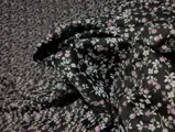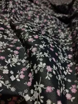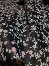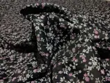 De warmgekleurde stof heeft een modern bloemendessin op een zwarte achtergrond, een uitstekende oplossing voor scenografische gordijnen, overdekkingen en/of gordijnen