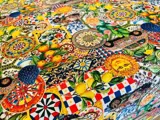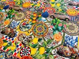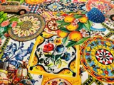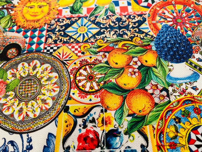 Mooie resistente Panama katoenen stof, digitale bedrukking met typisch Siciliaanse ontwerpen, heldere en heldere kleuren, ideaal voor inrichting en stoffering met stijl en elegantie elk type omgeving.