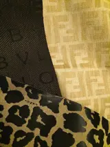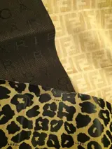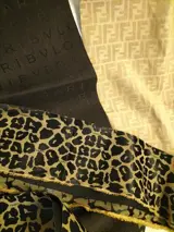 De Fendi-stof met luipaardprint is 380 cm lang x 14 cm breed, de Fendi-monogramstof is 48 cm lang x 39 cm breed en de Bulgari-stof is 150 cm lang x 21 cm breed.