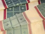 Damaststof gemaakt met garens van verschillende kleuren, waarbij het glanzend-matte effect wordt uitgebreid door het effect van de kleuren. Verfraaid met reliëfeffecten.